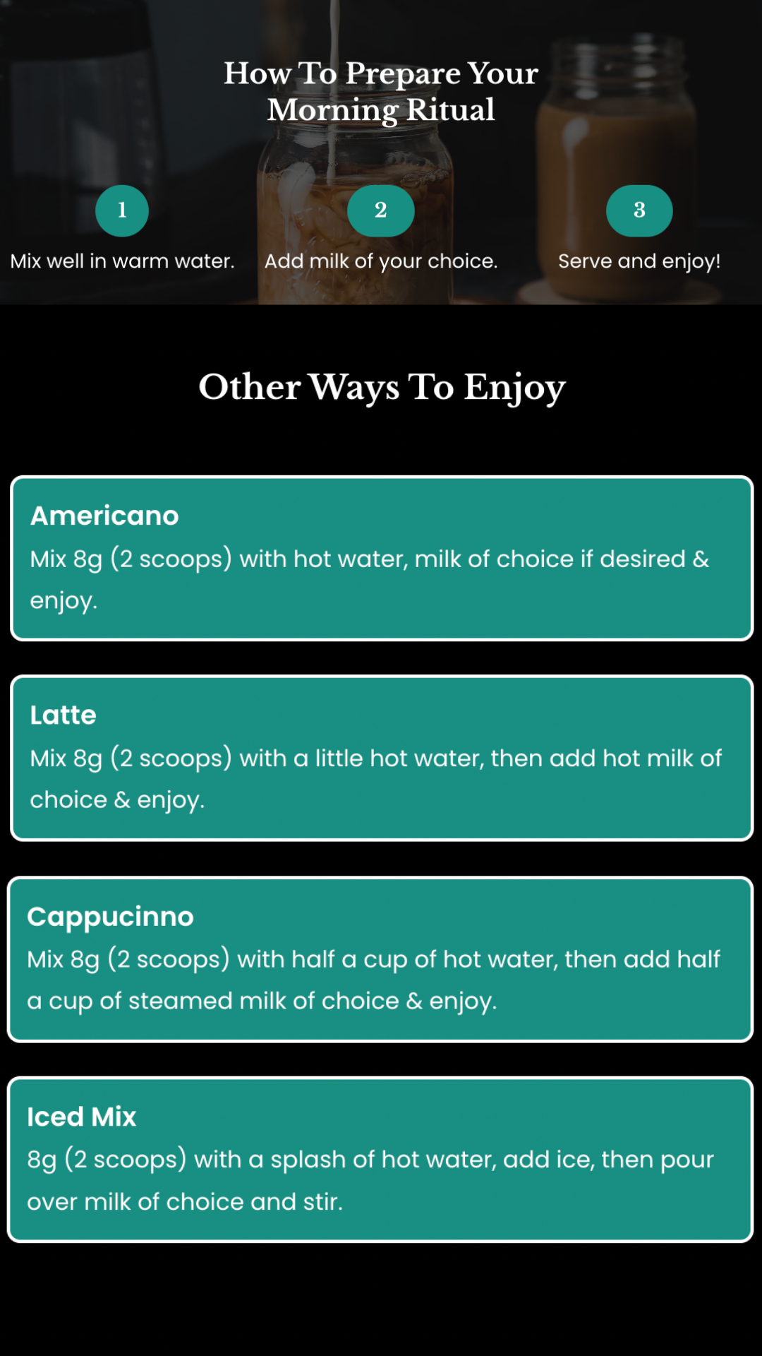 Treat Morning Magic as you would any normal coffee drink. Mix 2 teaspoon (8g) with hot water or warm milk. Stir well and enjoy. You can also add it to smoothies or protein shakes.