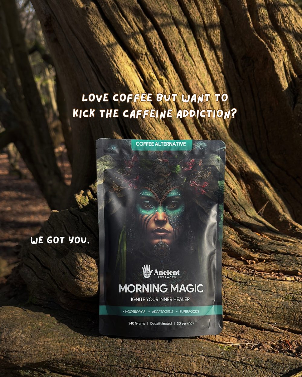 Ancient Extracts Morning Magic Decaf Mushroom Coffee Alternative is a 100% natural coffee alternative made from a blend of plants and root extracts.